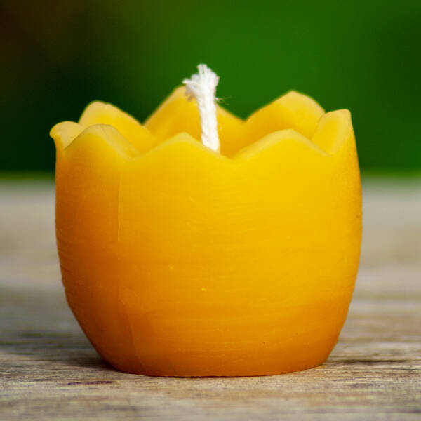 Leuke bijenwaskaars in de vorm van een uitgekomen ei met een hoogte van 4 cm.